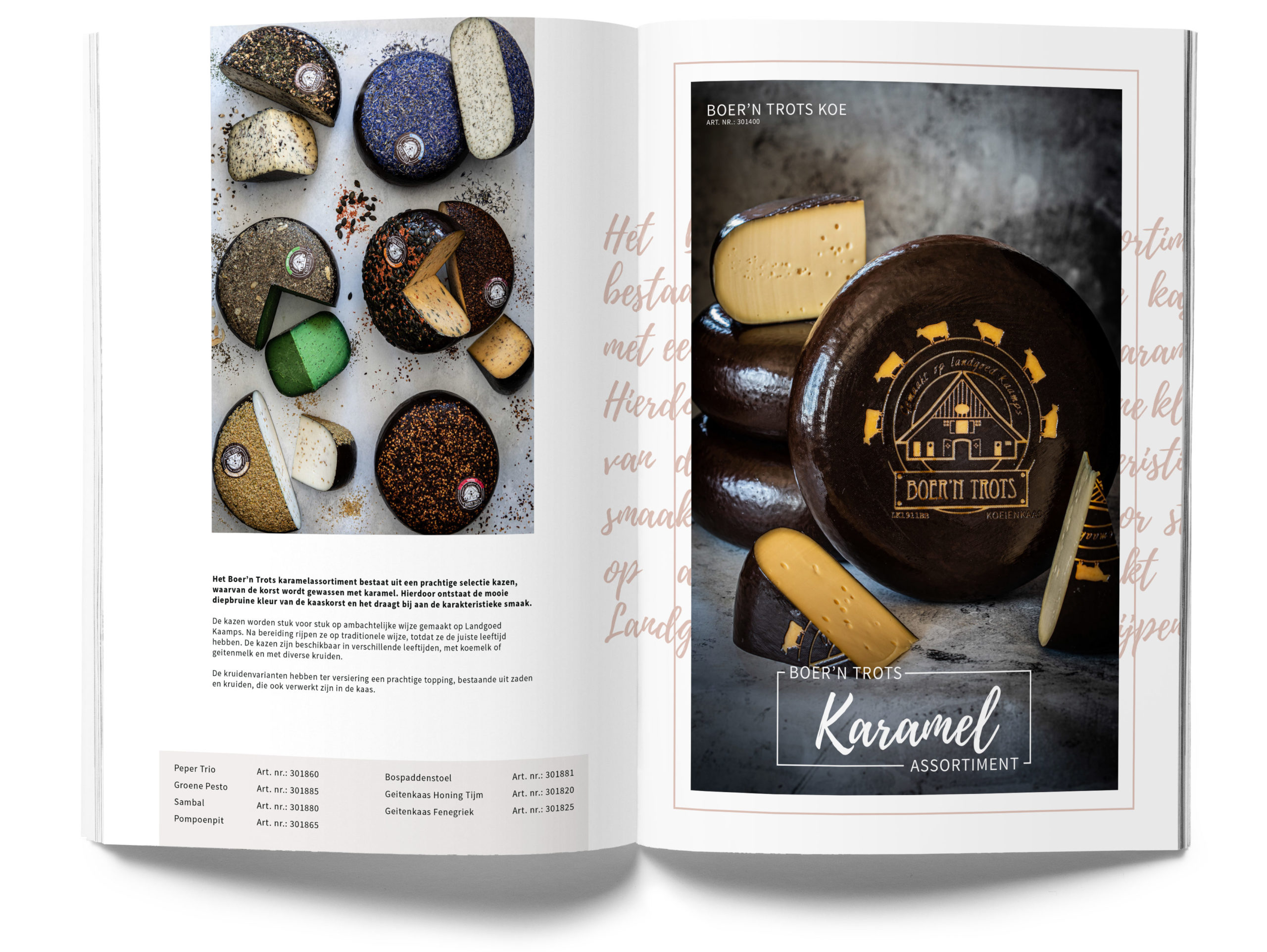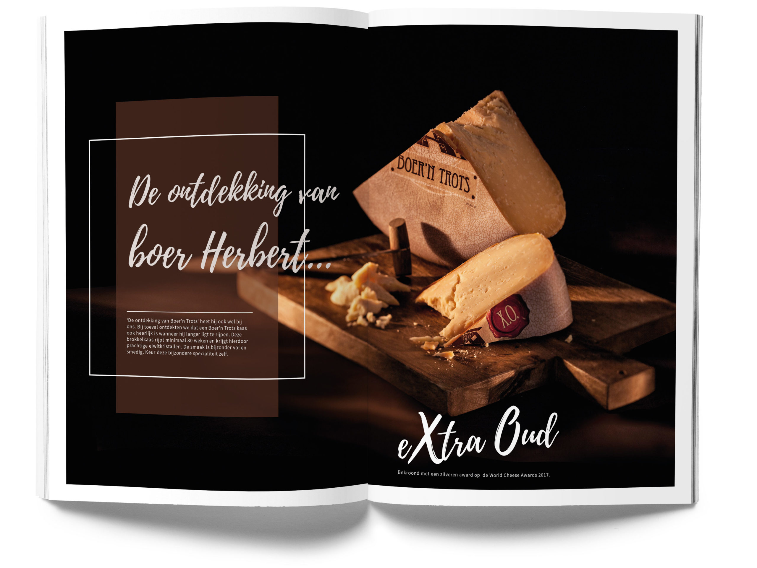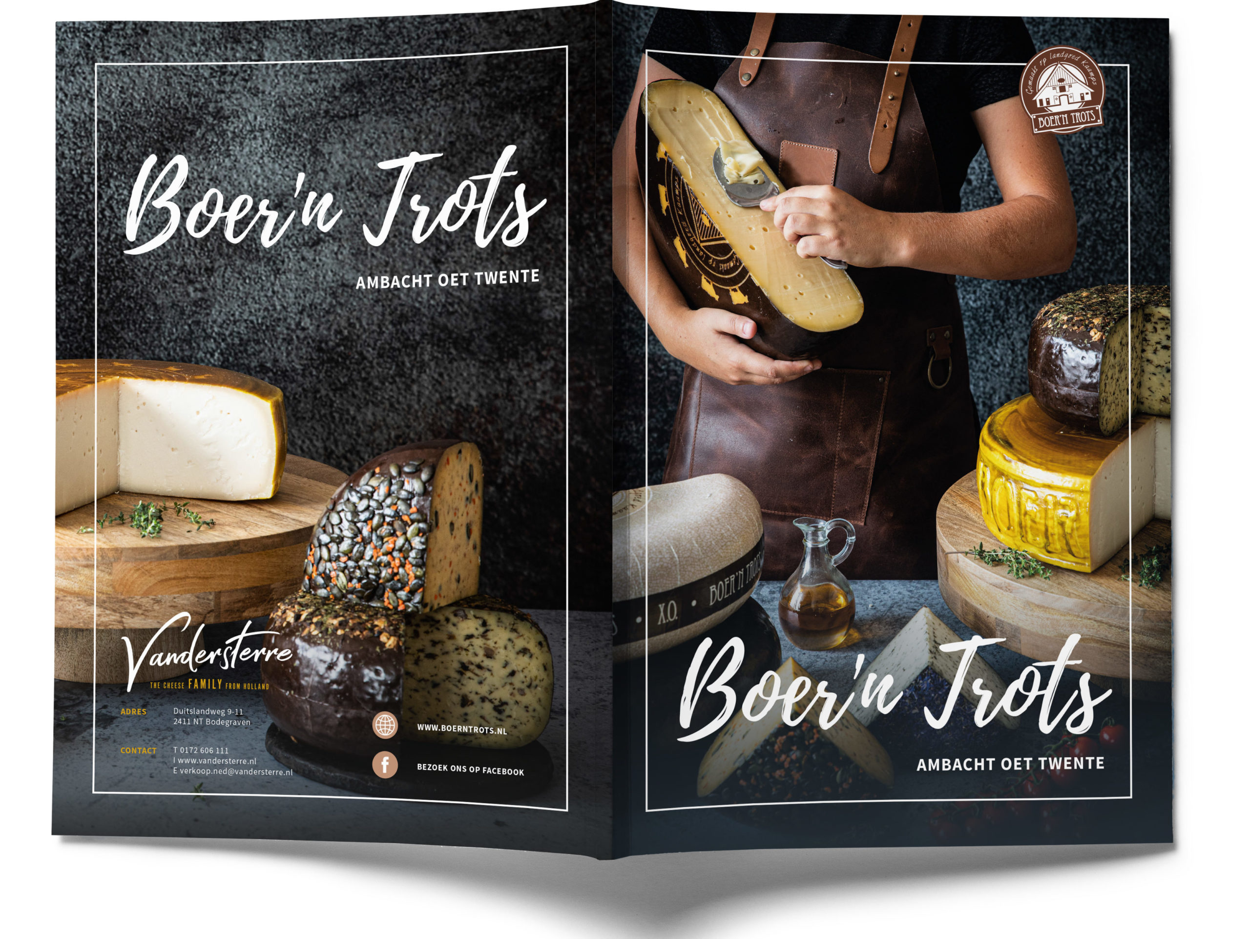 Voor het kaasmerk Boer’n Trots mocht ik de gehele huisstijl vernieuwen. Alleen een basiskleur en het logo bleven behouden. De opdracht was om de kaas en het boerenleven op een stoere en toegankelijke manier te vertalen in het ontwerp.