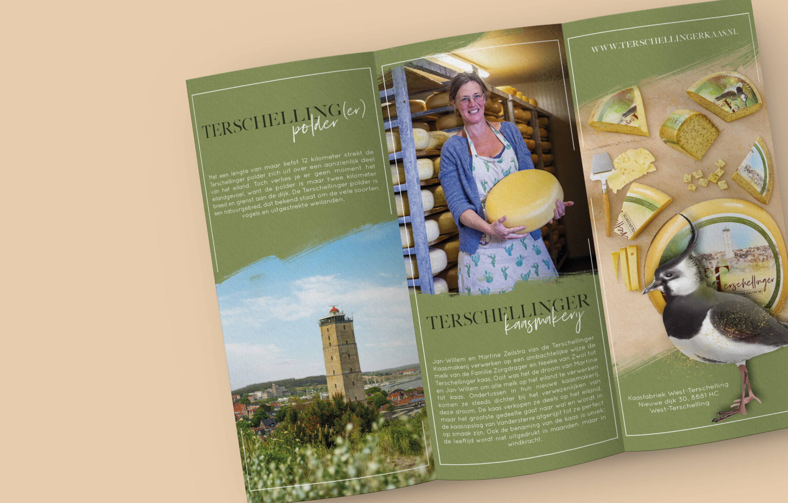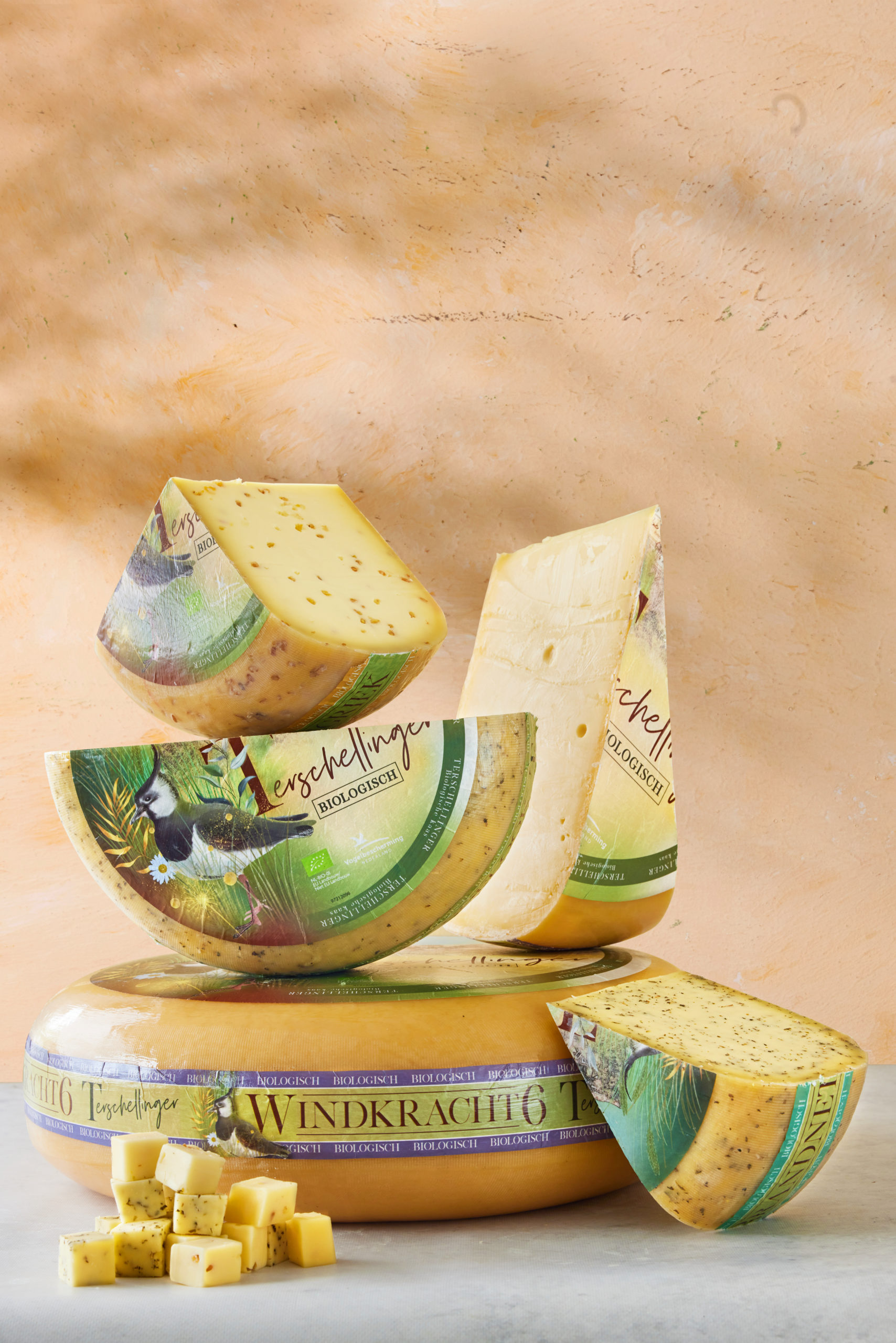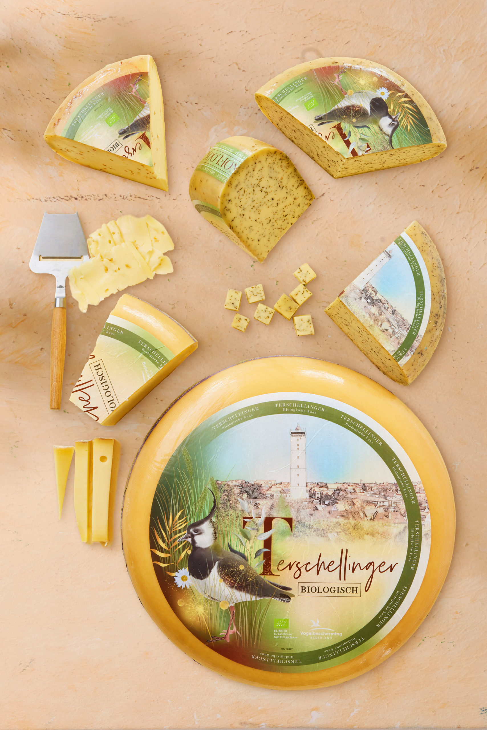 Terschelling, kaas, biologisch, dat is: Terschellinger kaas, kaas met een goed gevoel. Het eiland Terschelling is omzoomd door het kostbare waddengebied. Het toepassen van biologische landbouw en veeteelt is van groot belang om in dit natuurgebied de balans niet te verstoren. Bij kaasmakerij De Terschellinger B.V. wordt biologische kaas gemaakt met aandacht voor de weidevogels. Ik mocht de nieuwe merkuitstraling maken van hun kaas.